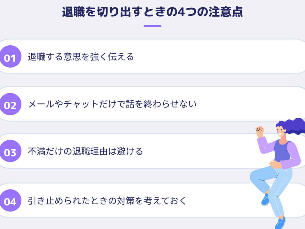 正式に退職を申し出るための手続きを進めます。以下のポイントに注意して進めます。