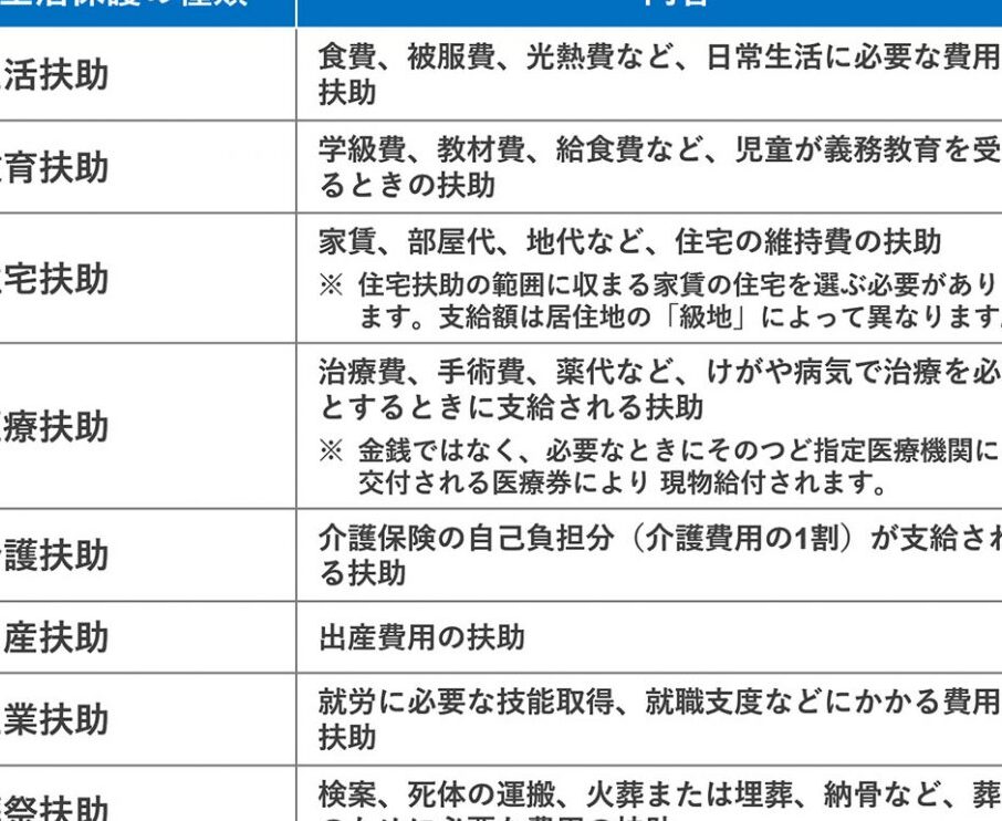 生活保護制度は、日本国民が経済的に自活できない状況に対し、最低限度の生活を保障するためのものです。具体的には、以下のような支援が行われます。