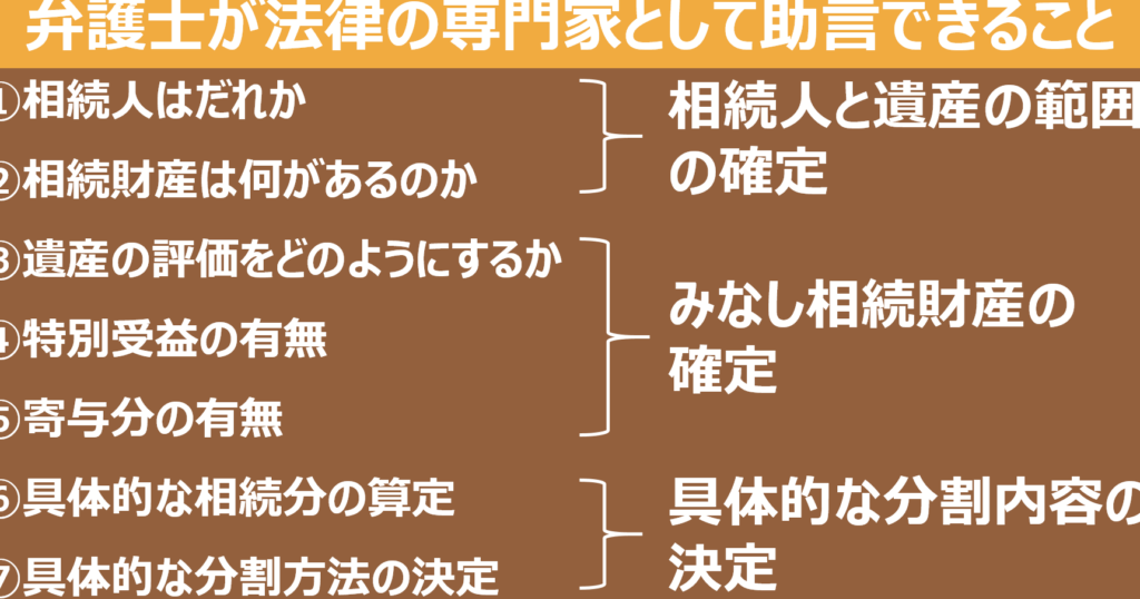 - 専門知識を活用する。弁護士は相続法に関する深い理解を持っているため、法律的な問題について確実なアドバイスを受けられます。