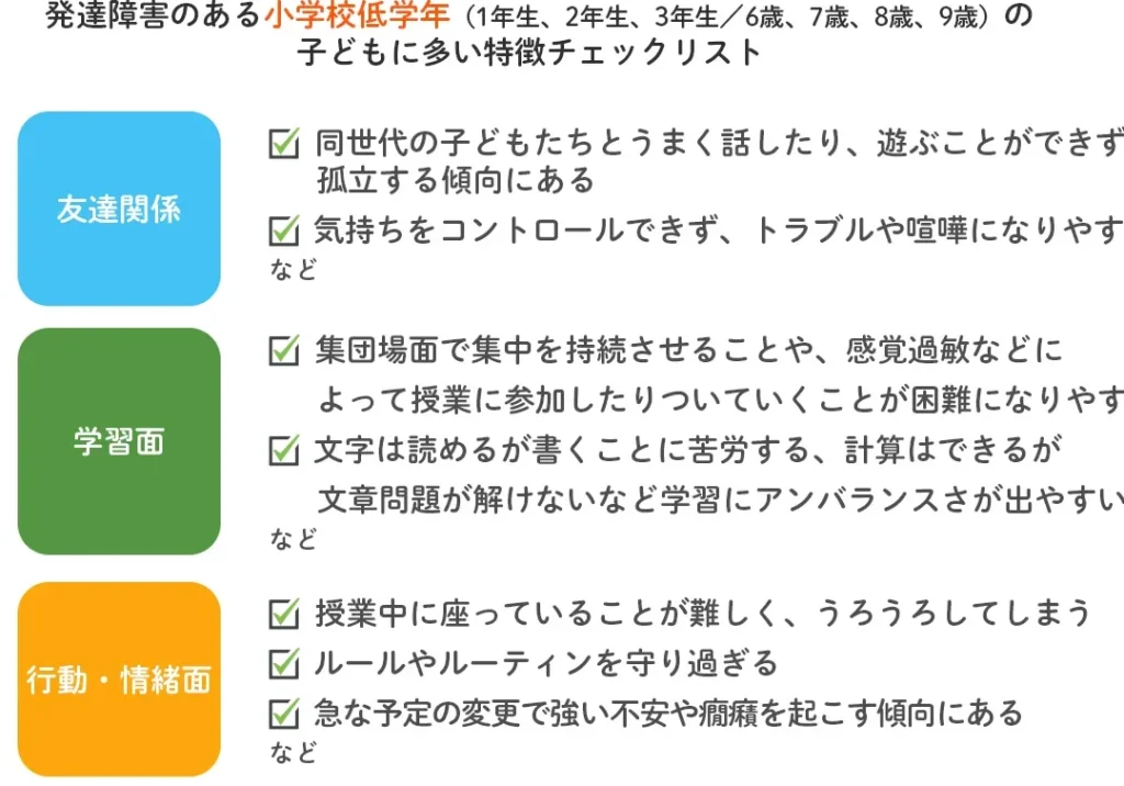 - 学習障害: 読み書きや計算などの学習に困難がある。