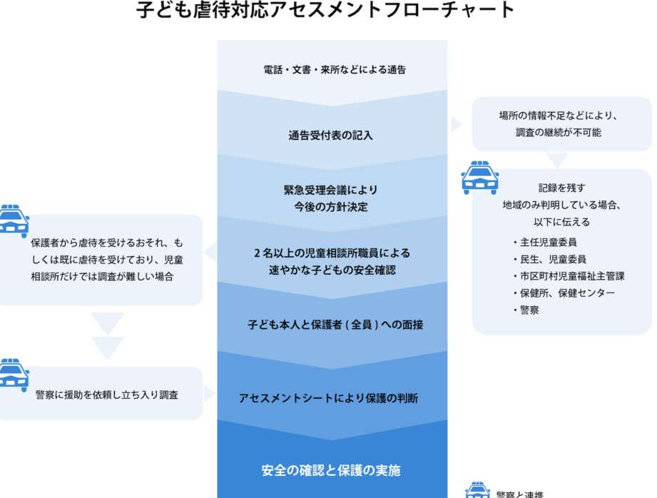 - 調査の実施: 通報後、児童相談所の専門家が調査を行い、子どもの状況を確認します。