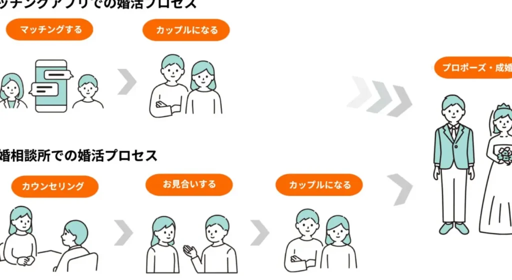 - 短期間で出会いを求めるならマッチングアプリ、長期的な支援を求めるなら結婚相談所に向いている。