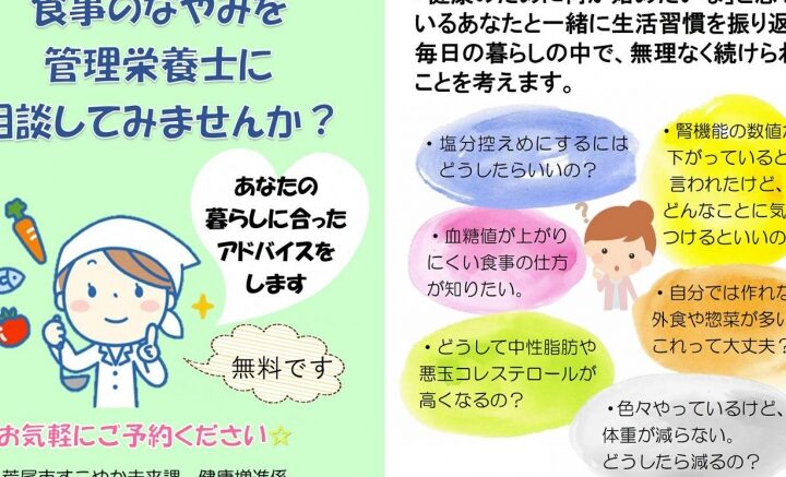 - 栄養士に相談予約をする。 地元の保健所や栄養相談センターで、専門家による個別相談を受けることが可能です。