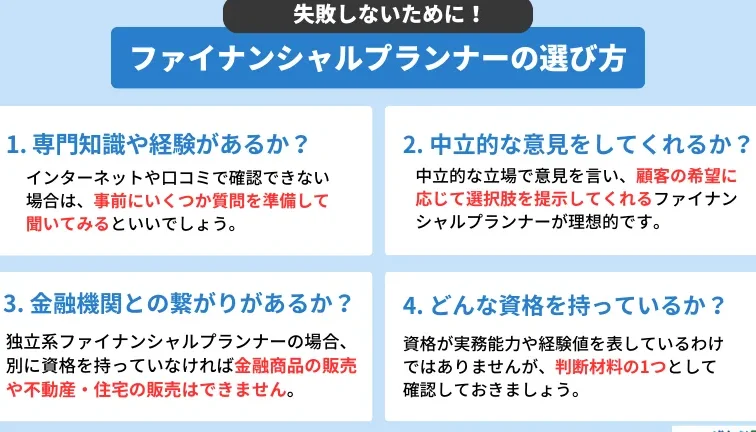 ファイナンシャルプランナーを選ぶことは、信頼できる相談相手を見つけるための重要なステップです。そのため、以下のポイントに注意して選定を進めましょう。