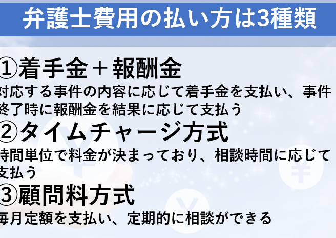 弁護士にかかる費用は主に以下の種類に分類されます。
